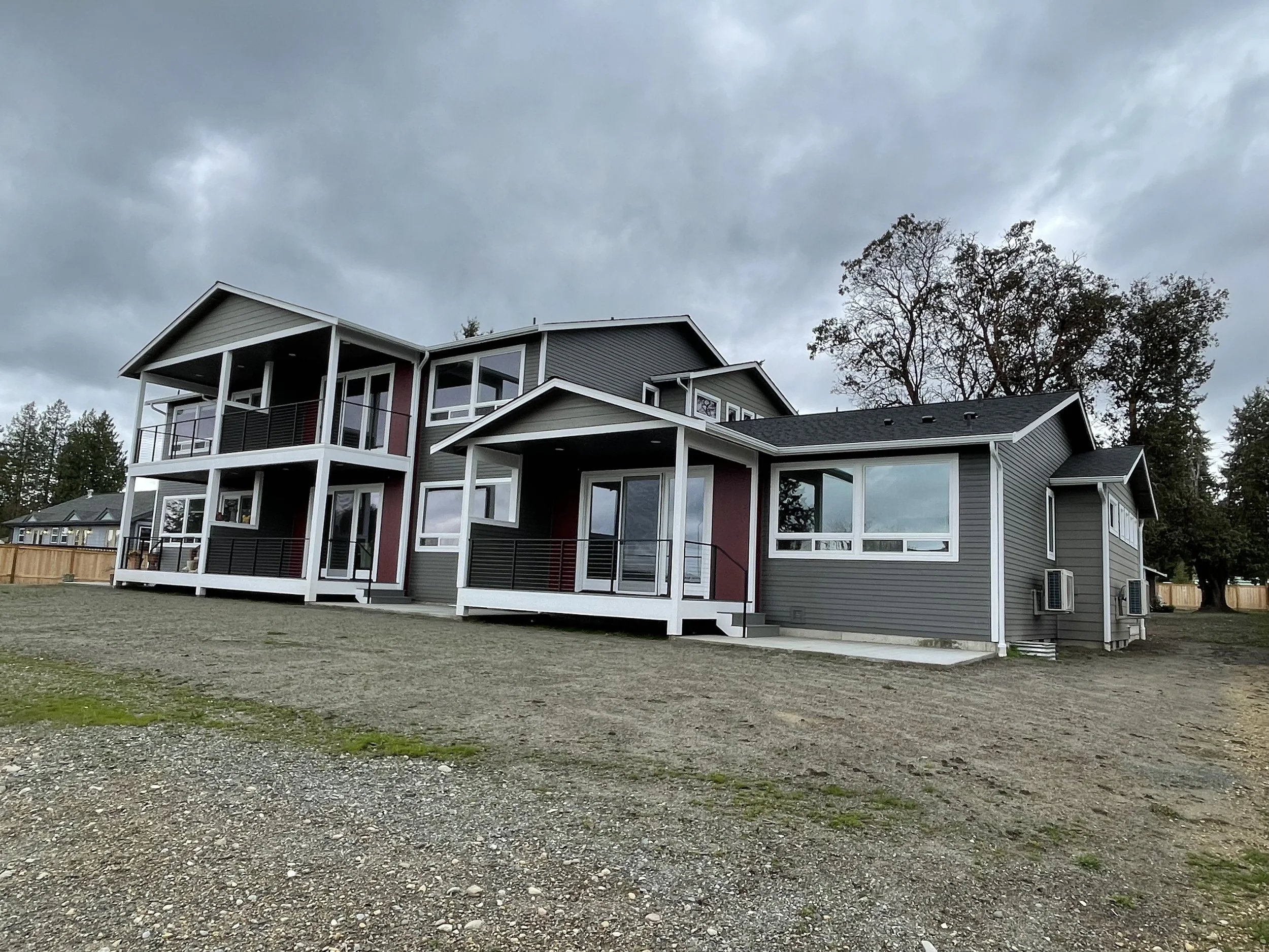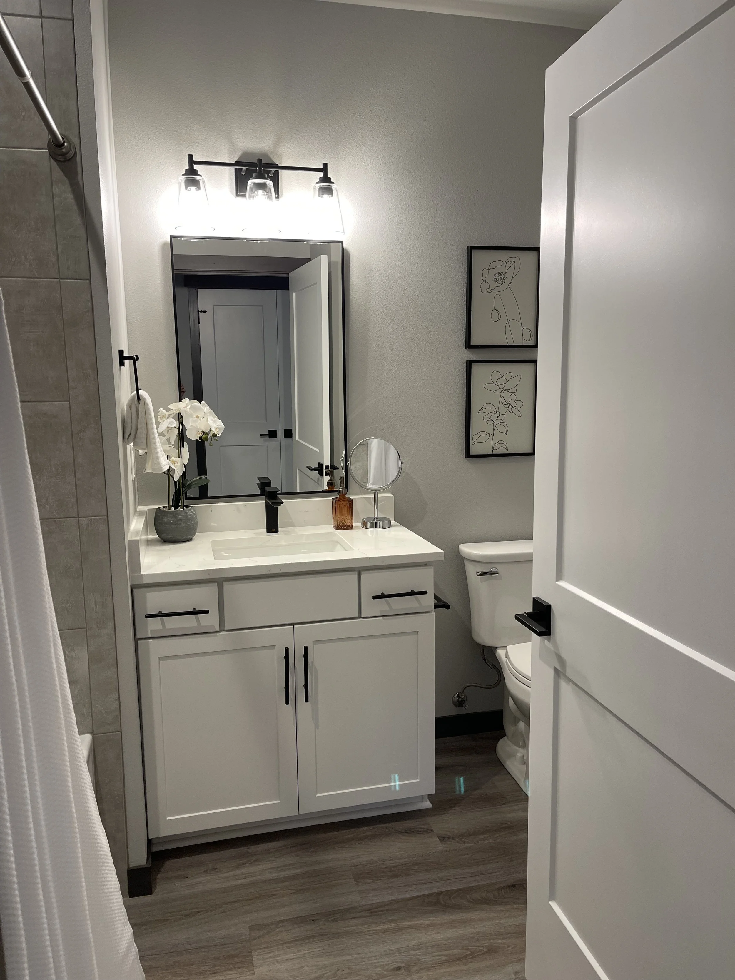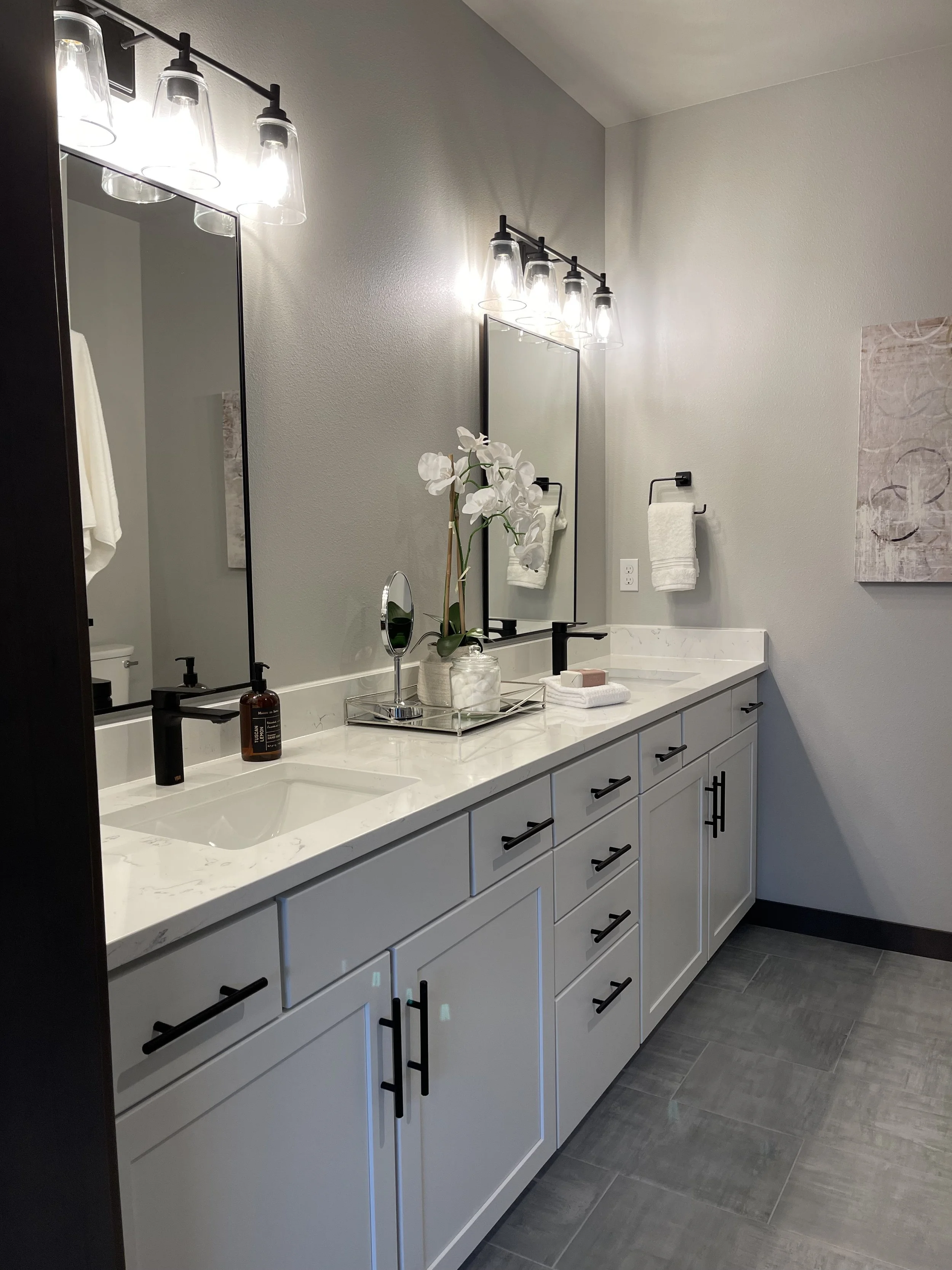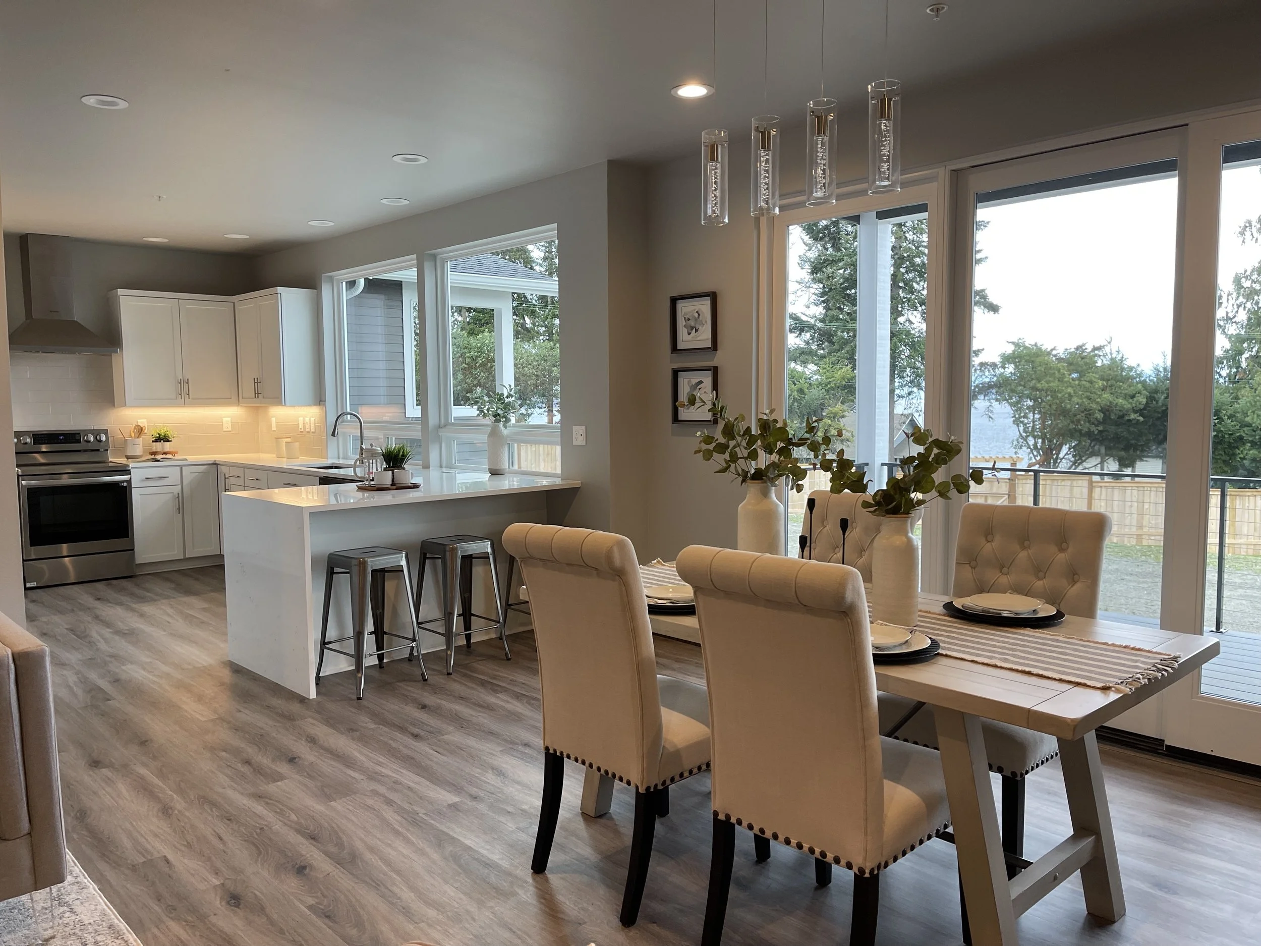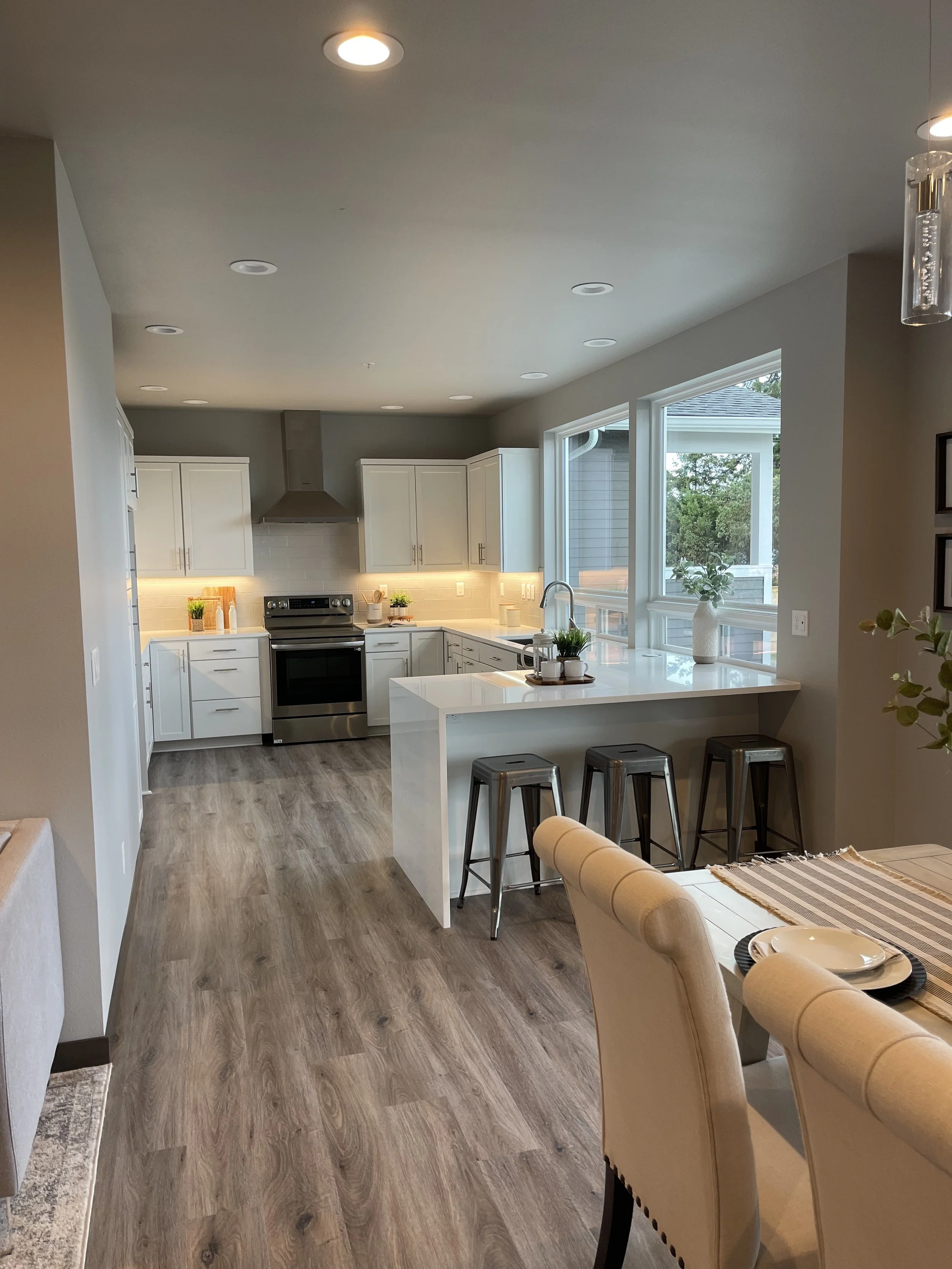 The wide plank vinyl flooring is really nice and the “Waterfall” edge on the peninsula. The windows come all the way down to the counter to increase the water view.