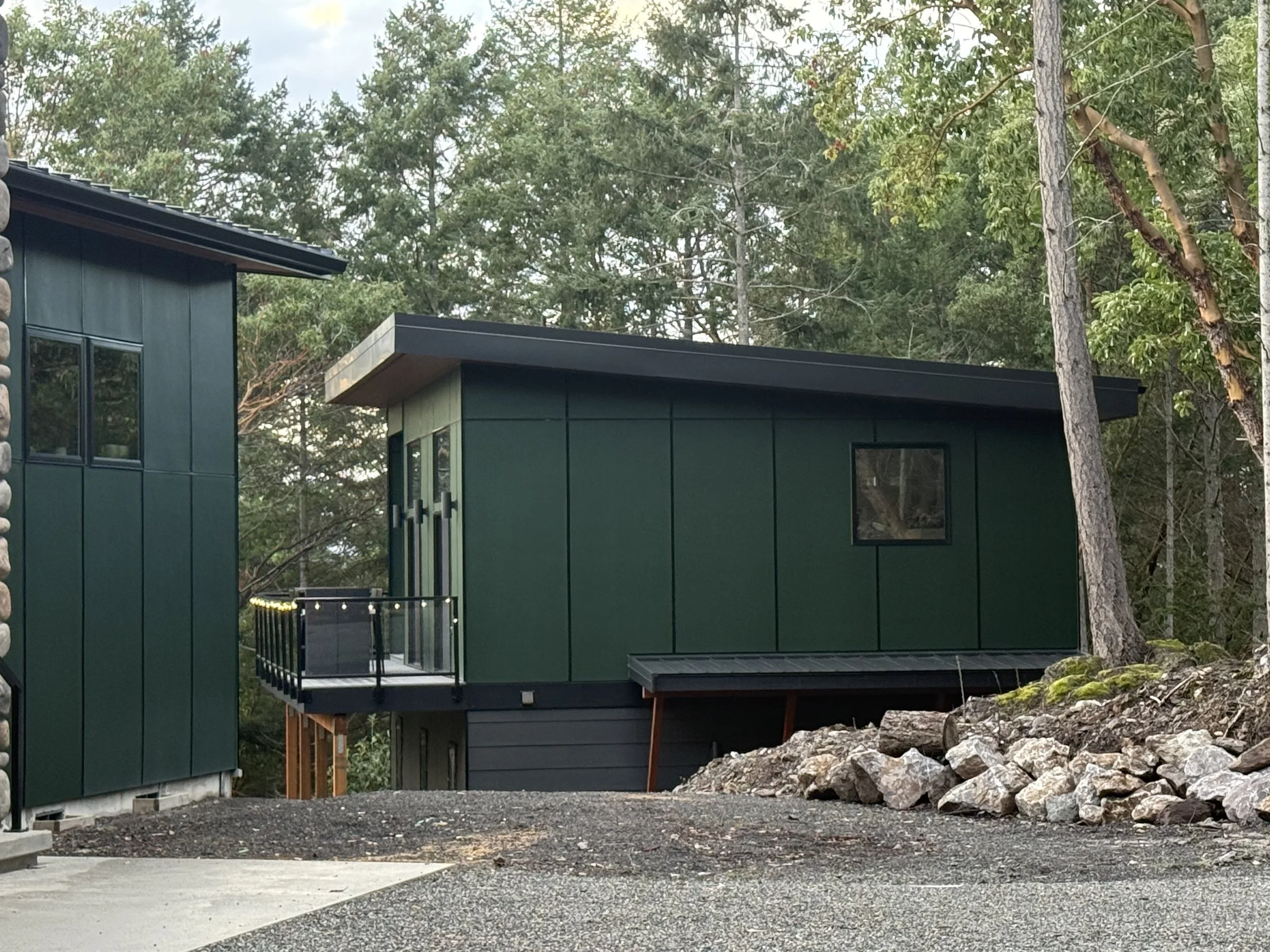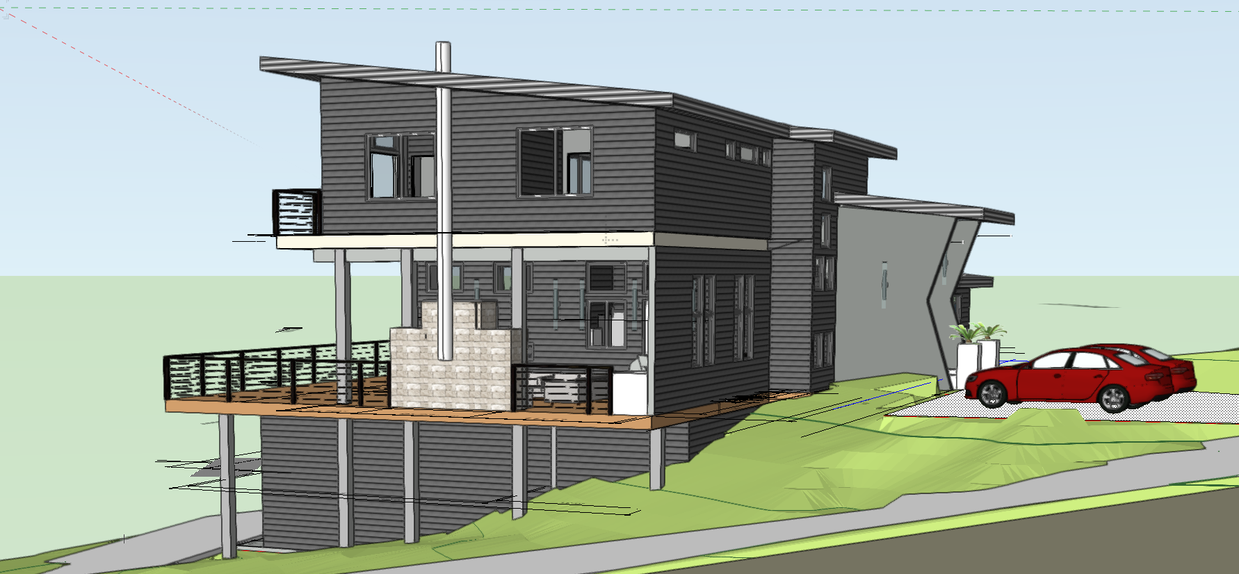 Model shot of how it was originally designed. They wanted to put a tv over the outdoor fireplace, so that stone fireplace wall got extended up. The green color was selected by the owners.