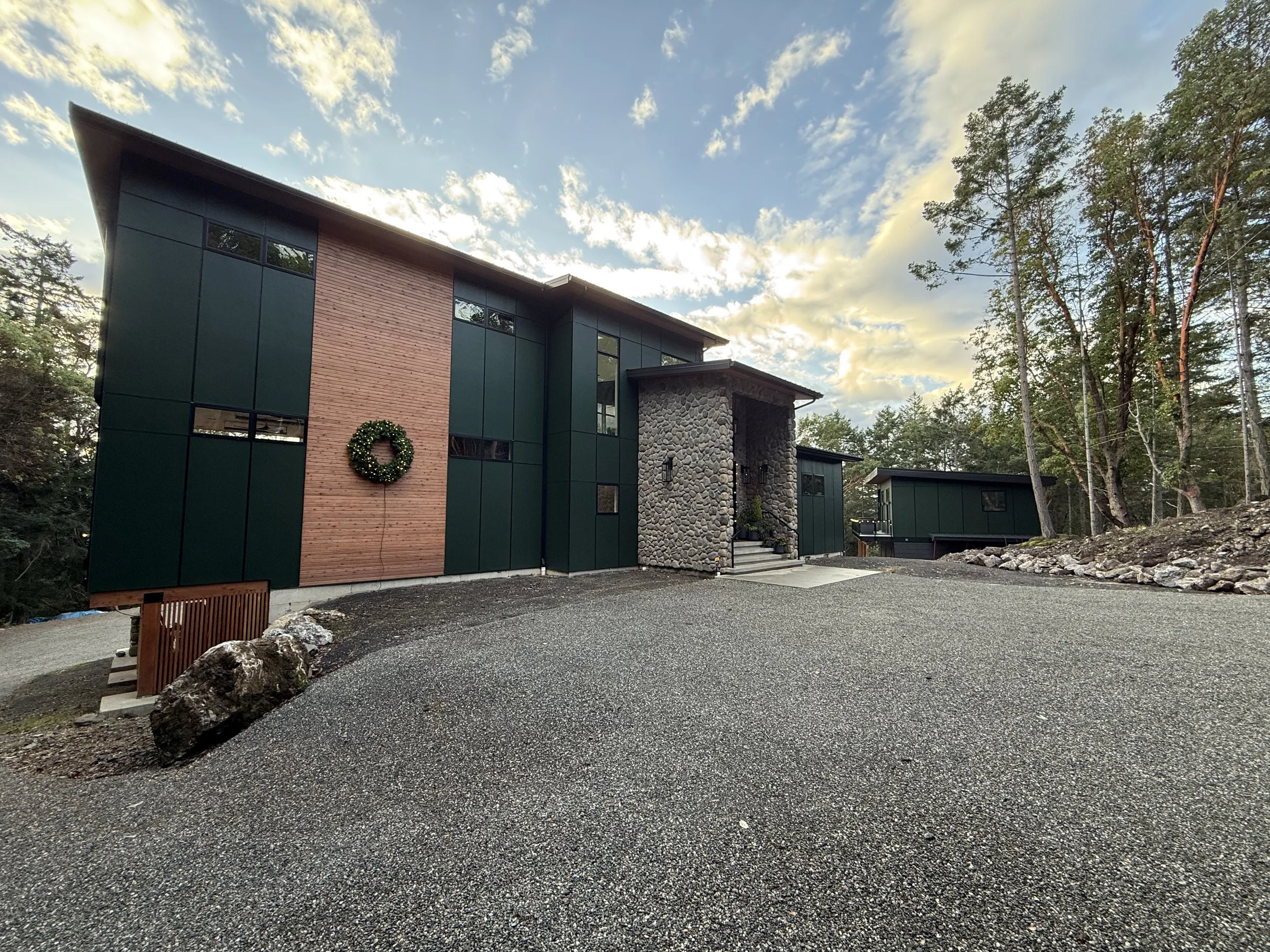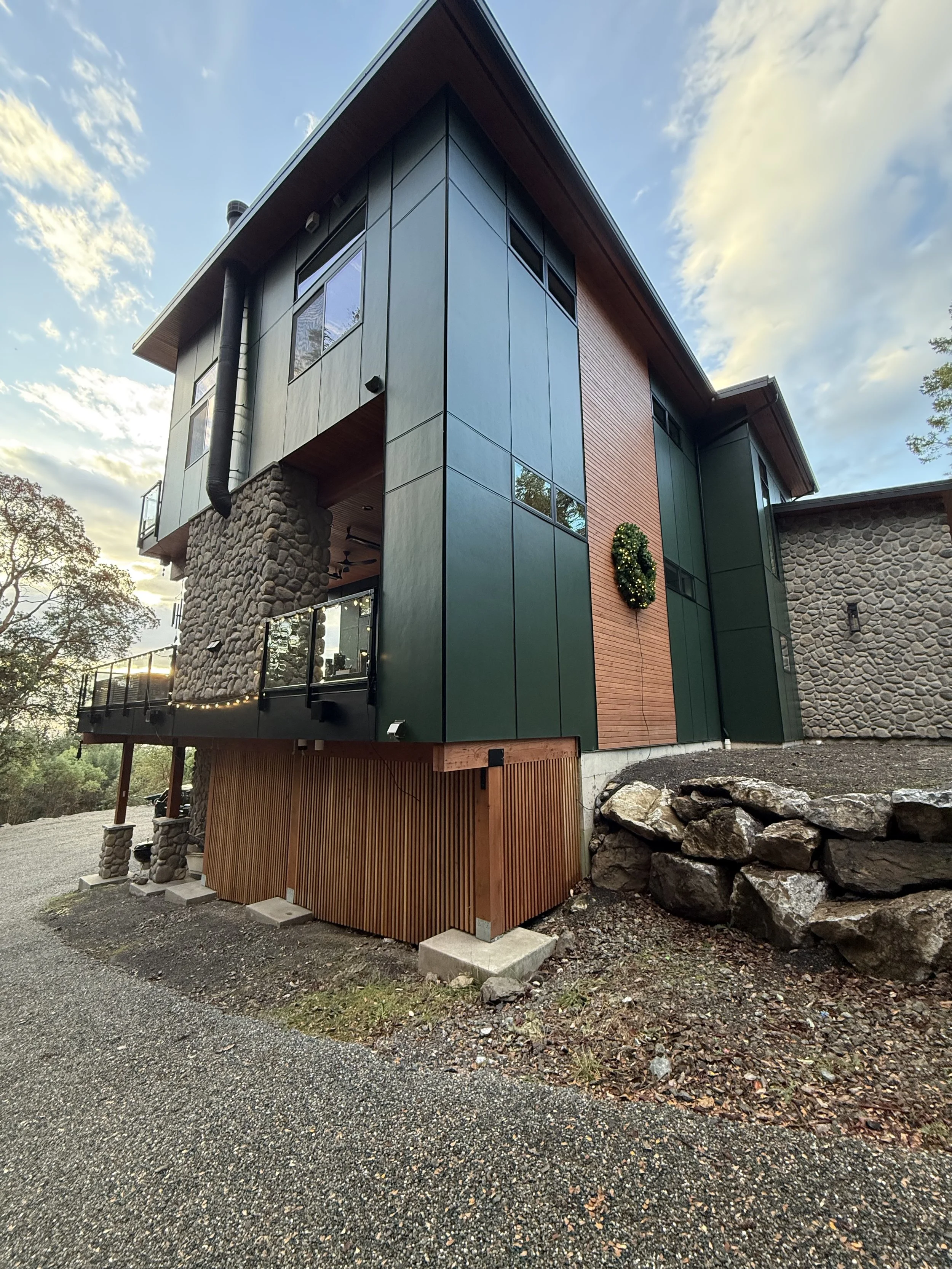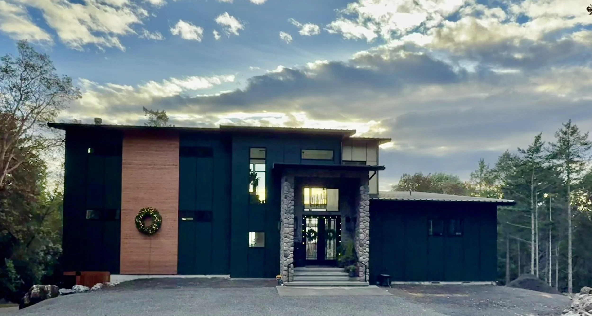 Complete with Holiday Wreath! The front entry got changed by the owners- it was supposed to be with slanting walls and more dramatic looking then straight fake stone walls…started this project in 2019! Finally done in 2025!