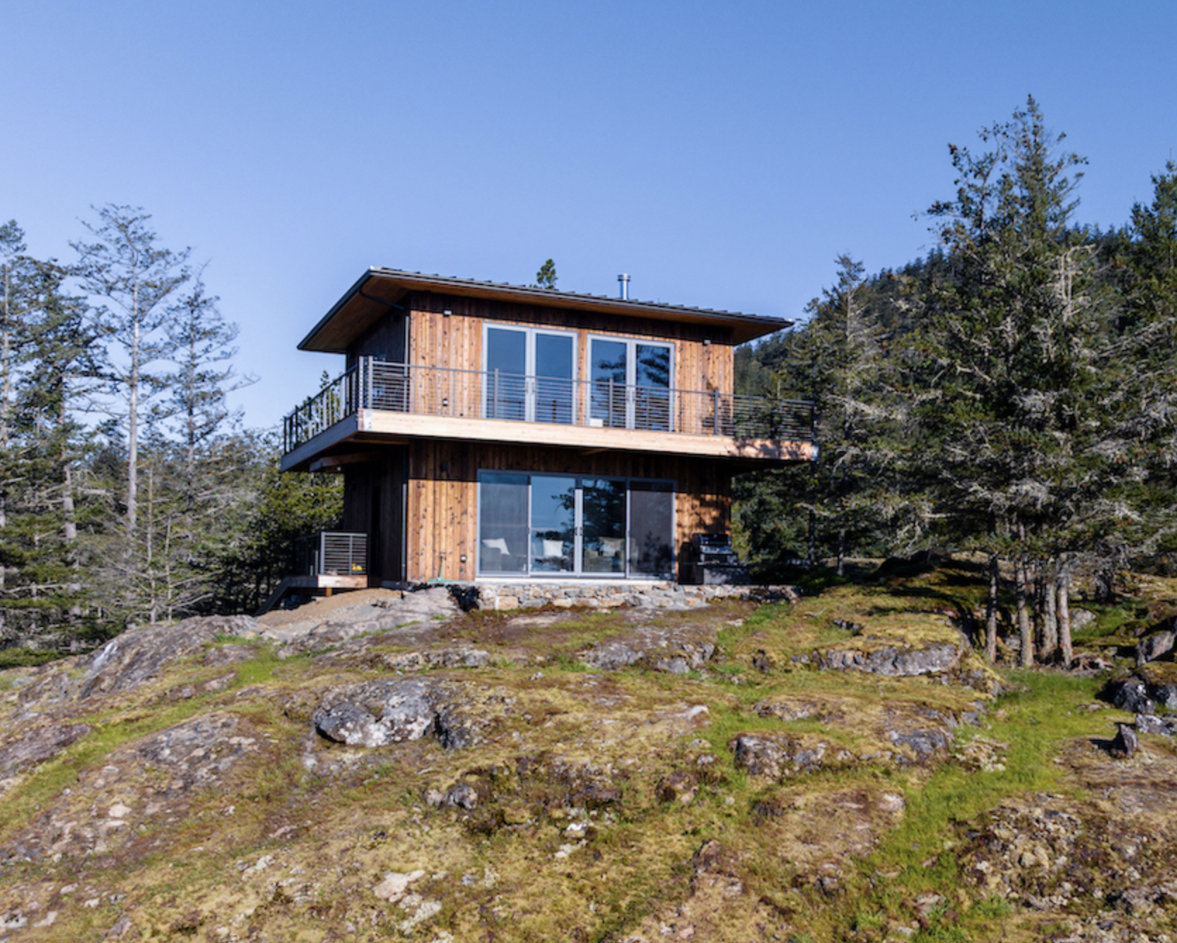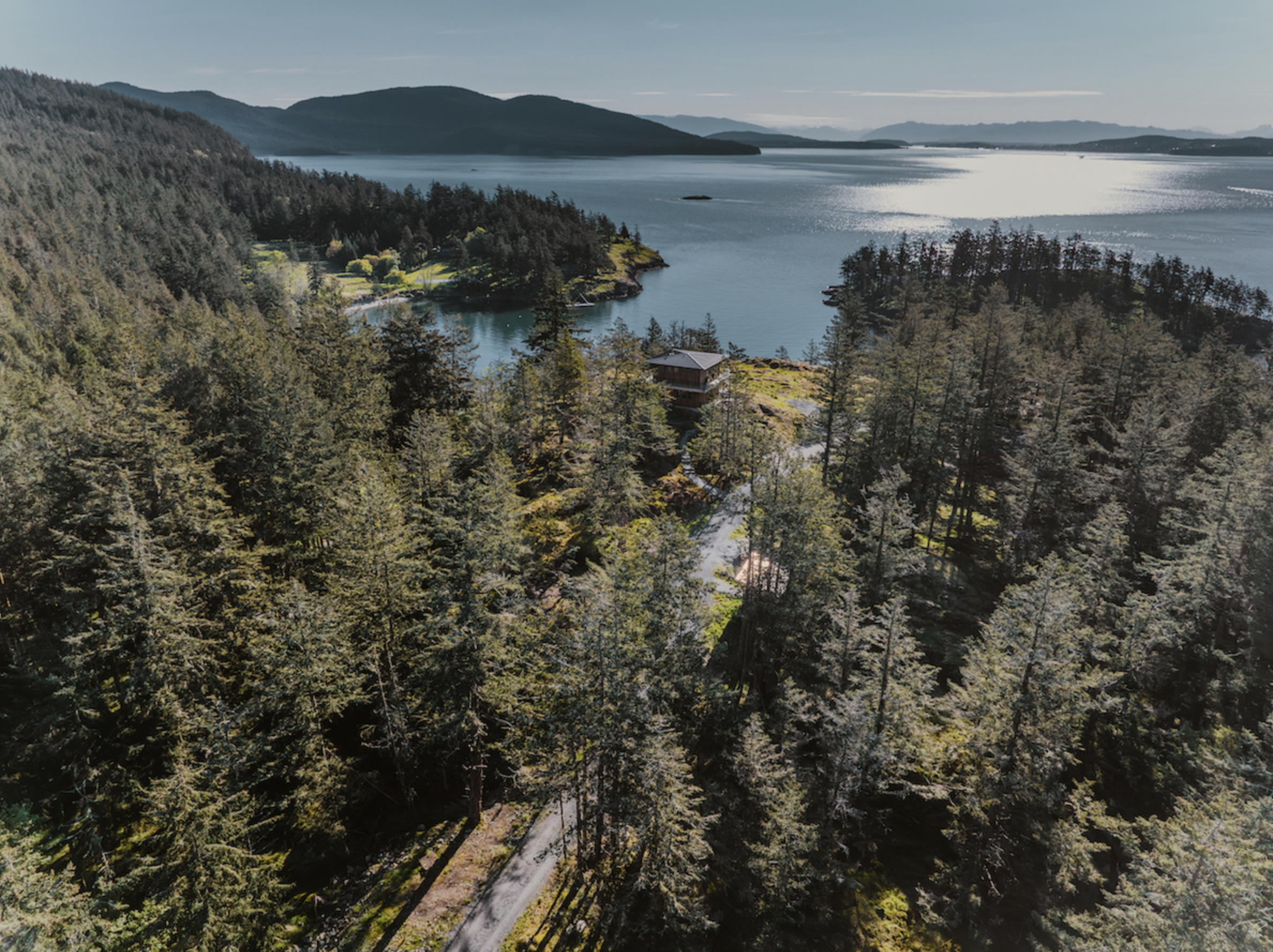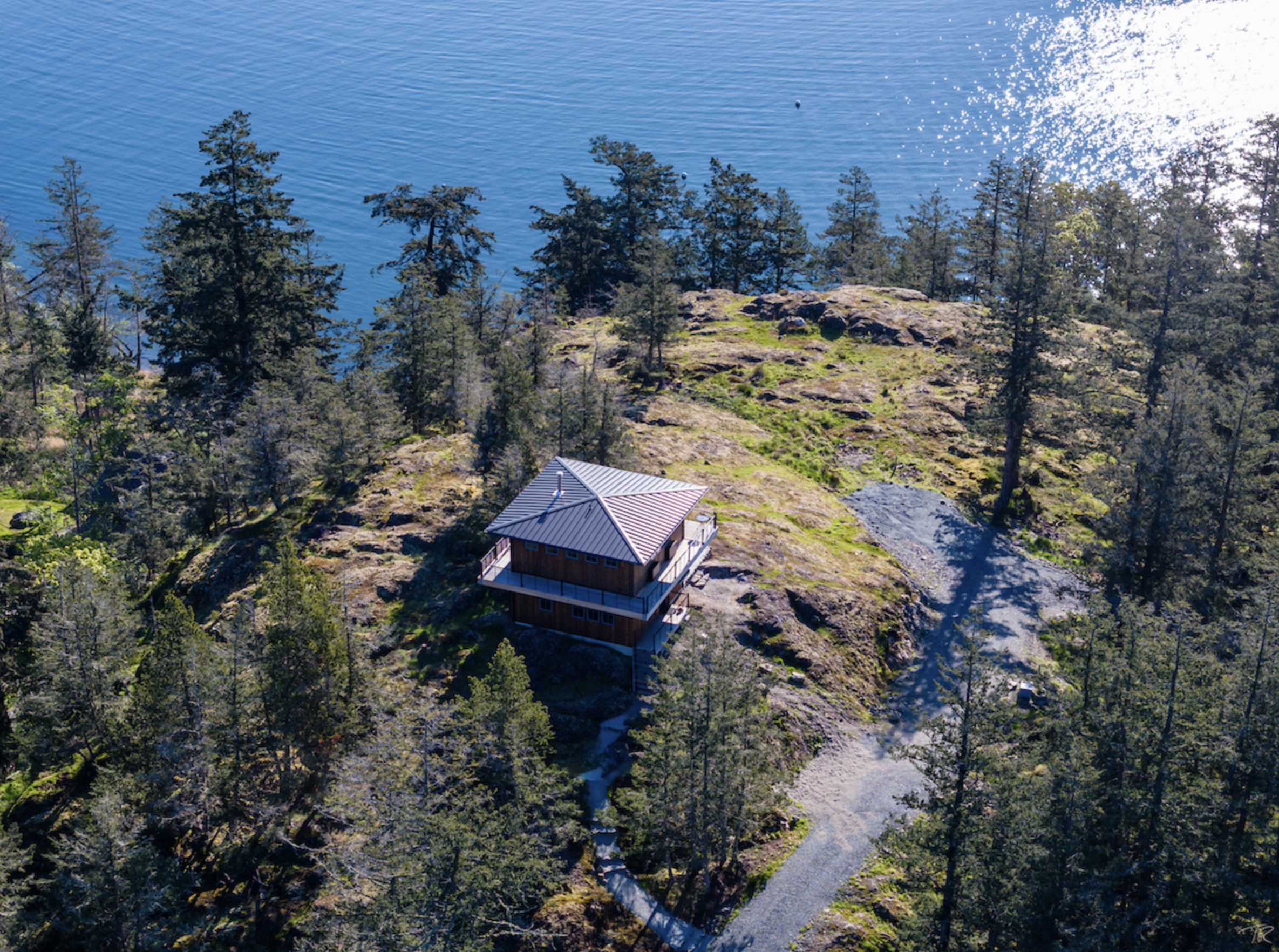 Building on an island is never easy, especially if there is no ferry service. Kaplan Construction had to barge in everything to a dock below this property and truck it up a steep uphill from the water. The site is magnificent! This is the 1st phase of a larger project to build a Main House further down on the bluff in the next 10 years. The cabin is a “Look-out” Tower that will look out over the future Main house.