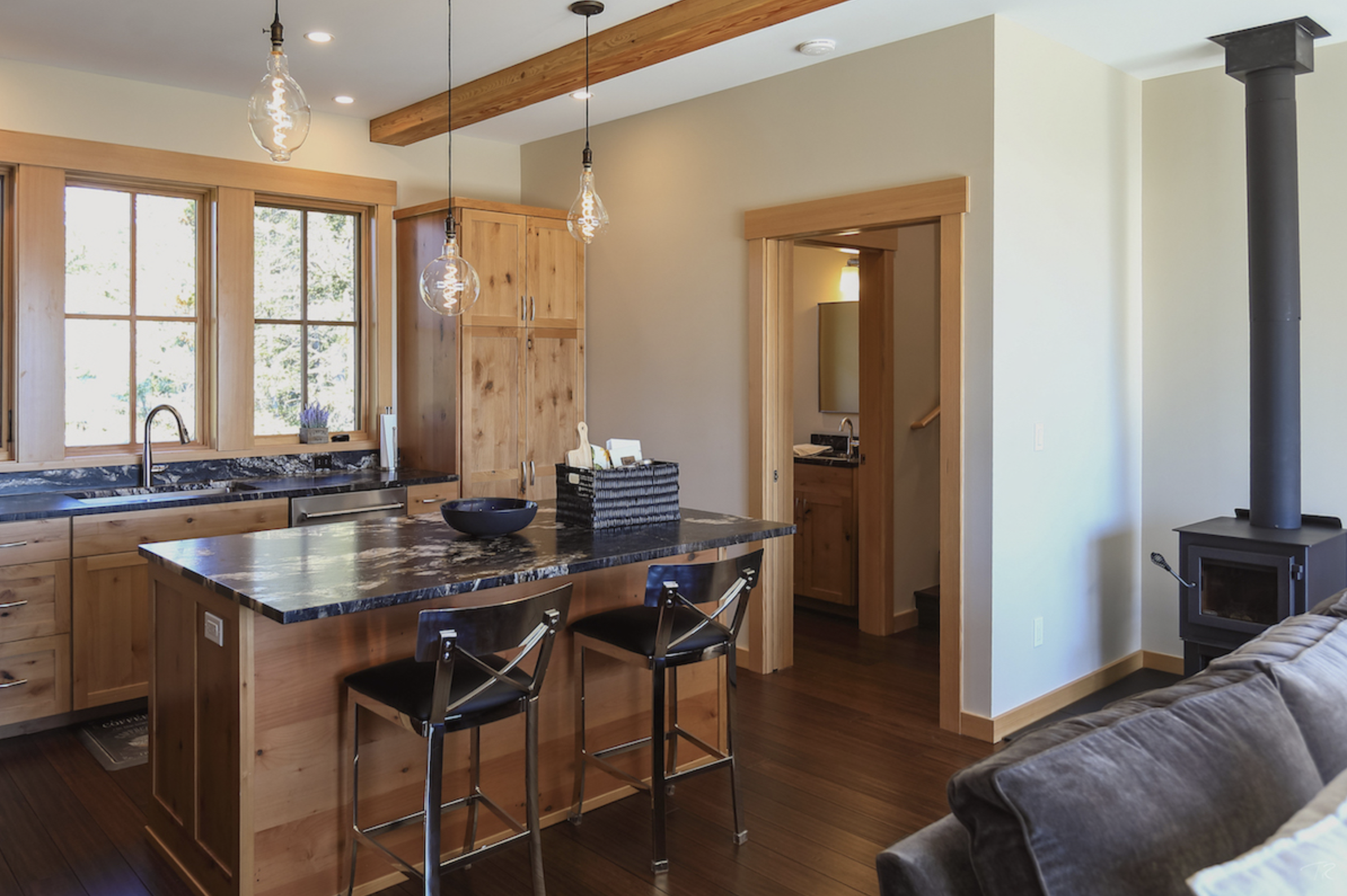 Kitchen, powder, living area with a hint of the stairs going to the bedroom upstairs.